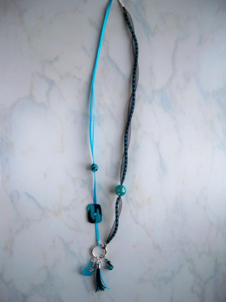 Sautoir résille, ruban, perles, couleur bleue et noire