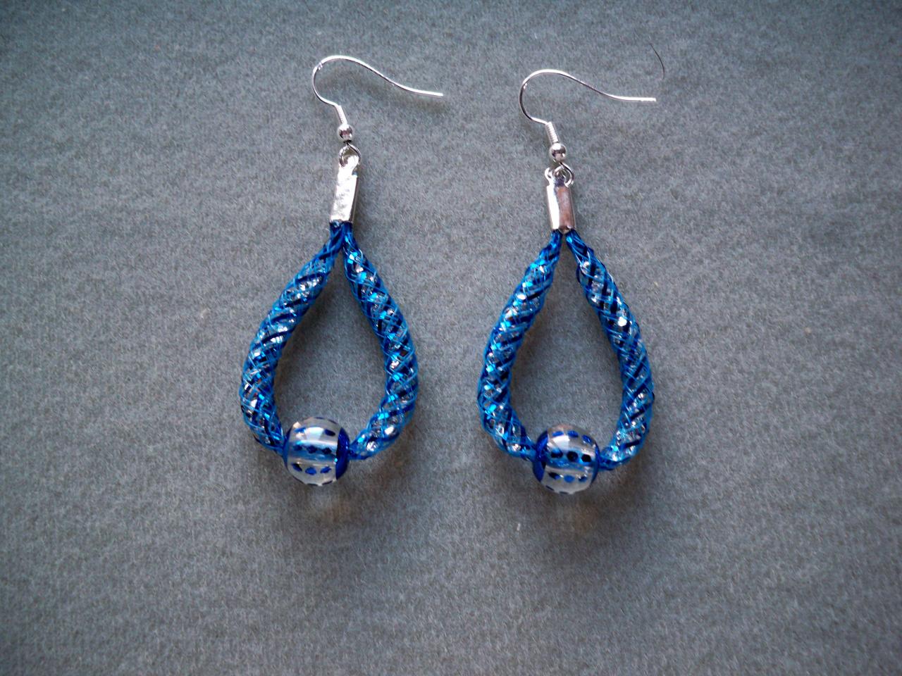 Boucles d'oreille en résille bleu dur filetée, strass et perles translucides bleu dur ; 5€