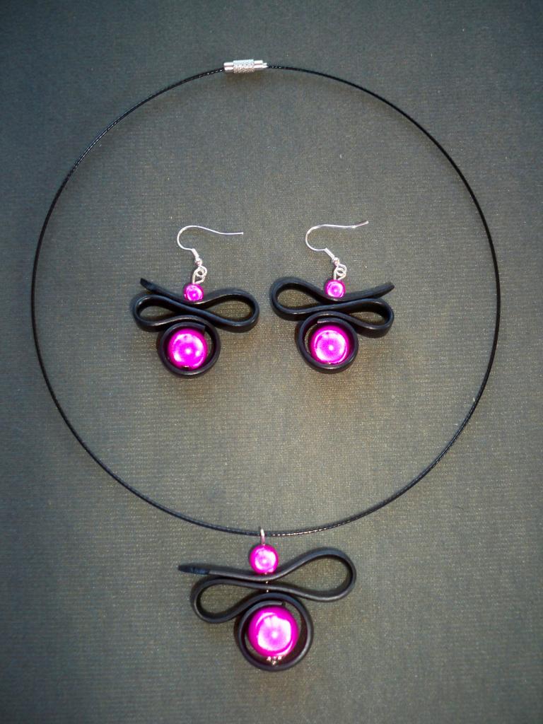Tour de cou et boucles d'oreilles perles magiques rose fuchsia et nœuds caoutchouc noir ; collier : 12€ ; boucles d'oreilles : 6€ ; l'ensemble 16€