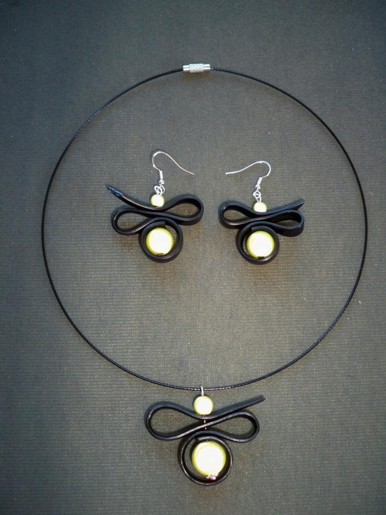 Tour de cou et boucles d'oreilles perles magiques blanches et nœuds caoutchouc noir ; collier : 12€ ; boucles d'oreilles : 6€ ; l'ensemble 16€