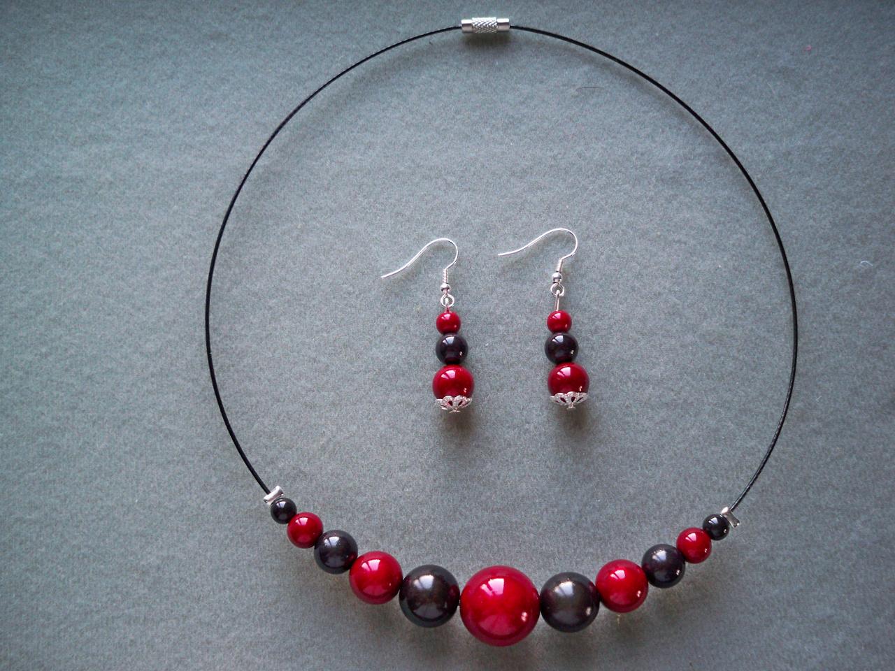 Collier et boucles d'oreilles rouge et gris foncé